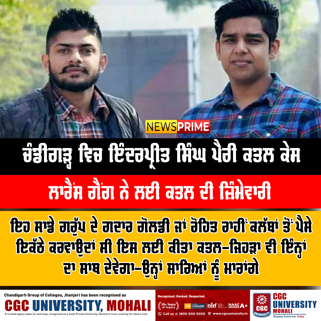 ਚੰਡੀਗੜ੍ਹ ‘ਚ ਇੰਦਰਪ੍ਰੀਤ ਸਿੰਘ ਪੈਰੀ ਦੇ ਕਤਲ ਨੂੰ ਗੋਲਡੀ ਬਰਾੜ ਨੇ ਲਾਰੈਂਸ ਨੂੰ ਦਿੱਤੀ ਧਮਕੀ