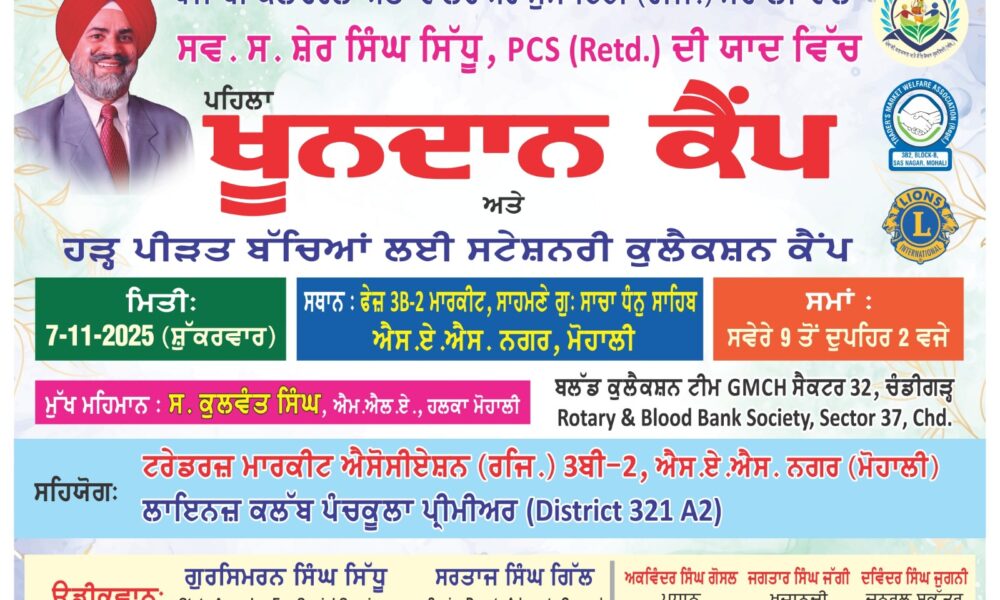ਐੱਸ. ਏ. ਐੱਸ. ਨਗਰ, 4 ਨਵੰਬਰ ( Kulwant Gill )- ਪੰਜਾਬੀ ਕਲਚਰਲ ਅਤੇ ਵੈੱਲਫੇਅਰ ਸੁਸਾਇਟੀ (ਰਜਿ.) ਮੁਹਾਲੀ ਵਲੋਂ ਸਵ. ਸ਼ੇਰ ਸਿੰਘ ਸਿੱਧੂ ਸੇਵਾ ਮੁਕਤ ਪੀ.ਸੀ.ਐਸ. ਦੀ...